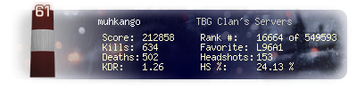 | Headshots | 153 | Suicides | 3 | Headshot / Kill | 24.13 % |