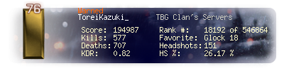 | Headshots | 151 | Suicides | 13 | Headshot / Kill | 26.17 % |
